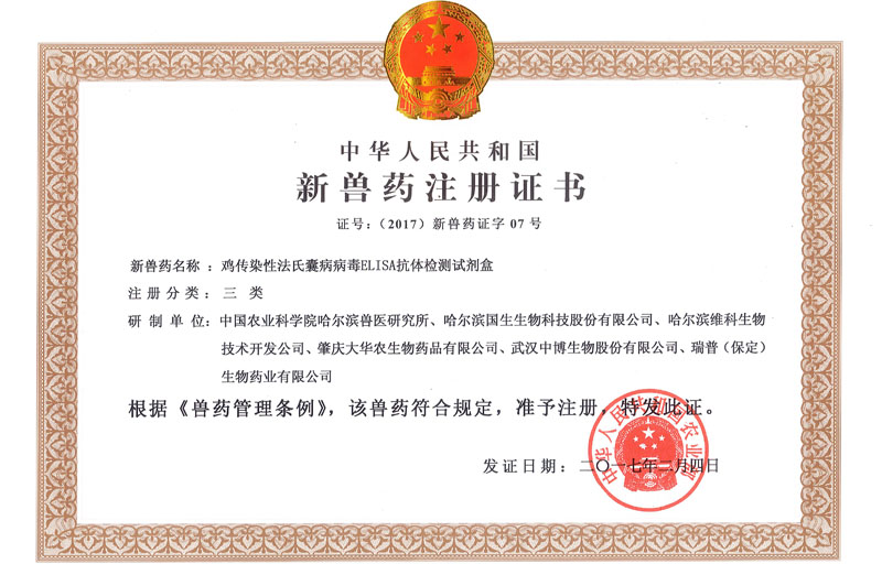 2017年2月4日,農(nóng)業(yè)部發(fā)布第2490號(hào)公告,由中國(guó)農(nóng)業(yè)科學(xué)院哈爾濱獸醫(yī)研究所(以下簡(jiǎn)稱哈獸研)、哈爾濱國(guó)生生物科技股份有限公司(動(dòng)物用生物制品國(guó)家工程研究中心,以下簡(jiǎn)稱國(guó)生生物)、哈爾濱維科生物技術(shù)開(kāi)發(fā)公司、肇慶大華農(nóng)生物制品有限公司、武漢中博生物股份有限公司和瑞普(保定)生物藥業(yè)有限公司6家單位聯(lián)合研發(fā)的雞傳染性法氏囊病病毒ELISA抗體檢測(cè)試劑盒,獲批新獸藥注冊(cè)證書(shū)(2017新獸藥證字07號(hào))。該產(chǎn)品由哈獸研王笑梅研究員為首席科學(xué)家的禽免疫抑制病團(tuán)隊(duì)研制,由國(guó)生生物承擔(dān)相關(guān)孵化工作。
